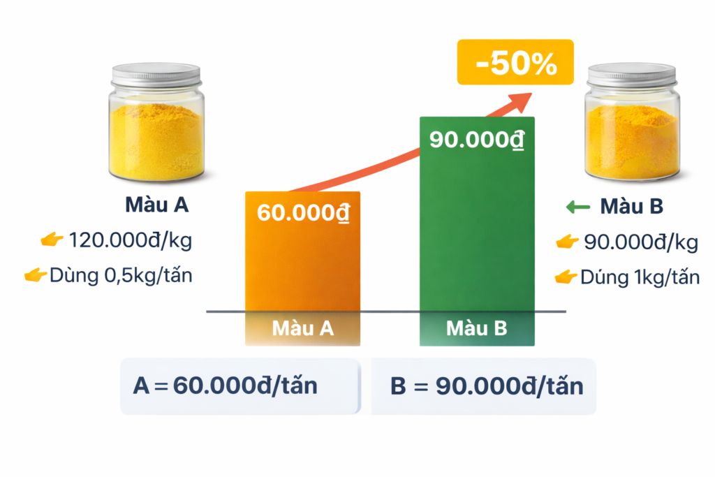Trong ngành sản xuất thực phẩm, thức ăn chăn nuôi, thủy sản hay thuốc thú y, màu thực phẩm thường được xem là một nguyên liệu phụ và vì chiếm tỷ trọng chi phí thấp nên nhiều doanh nghiệp có xu hướng lựa chọn dựa trên tiêu chí giá/kg. Tuy nhiên, thực tế sản xuất cho thấy việc chỉ nhìn vào giá ban đầu có thể dẫn đến tổng chi phí cao hơn đáng kể trong dài hạn, ảnh hưởng trực tiếp đến hiệu quả vận hành và lợi nhuận.